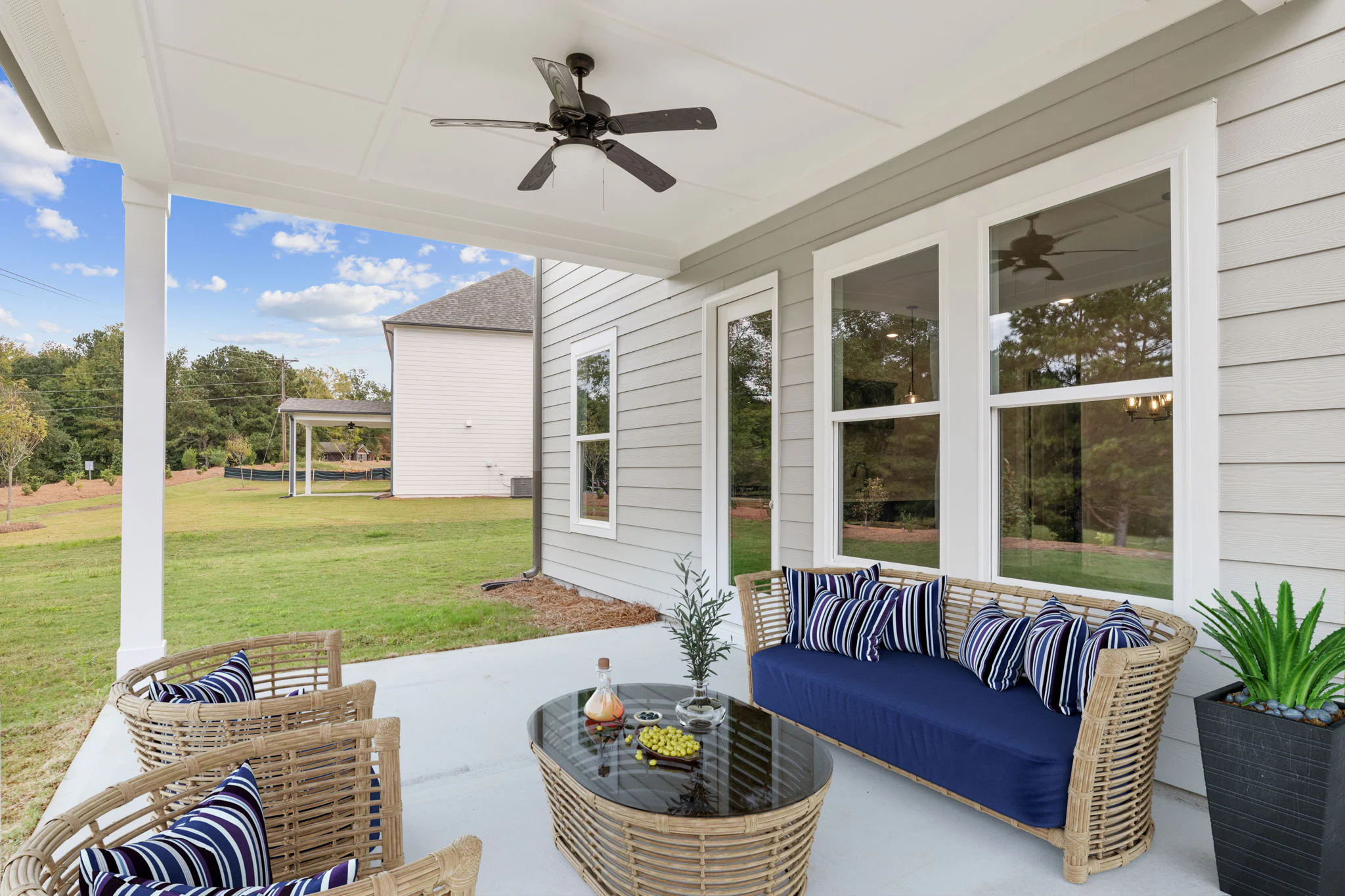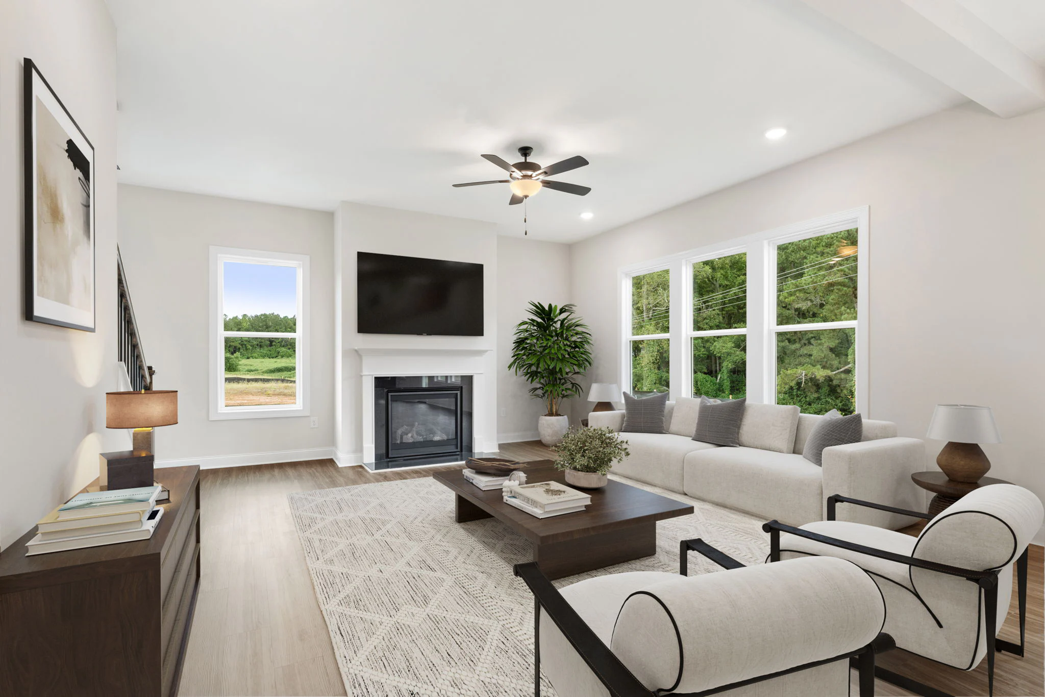 Great Room with Fireplace Opens to Dining, Kitchen and Covered Patio