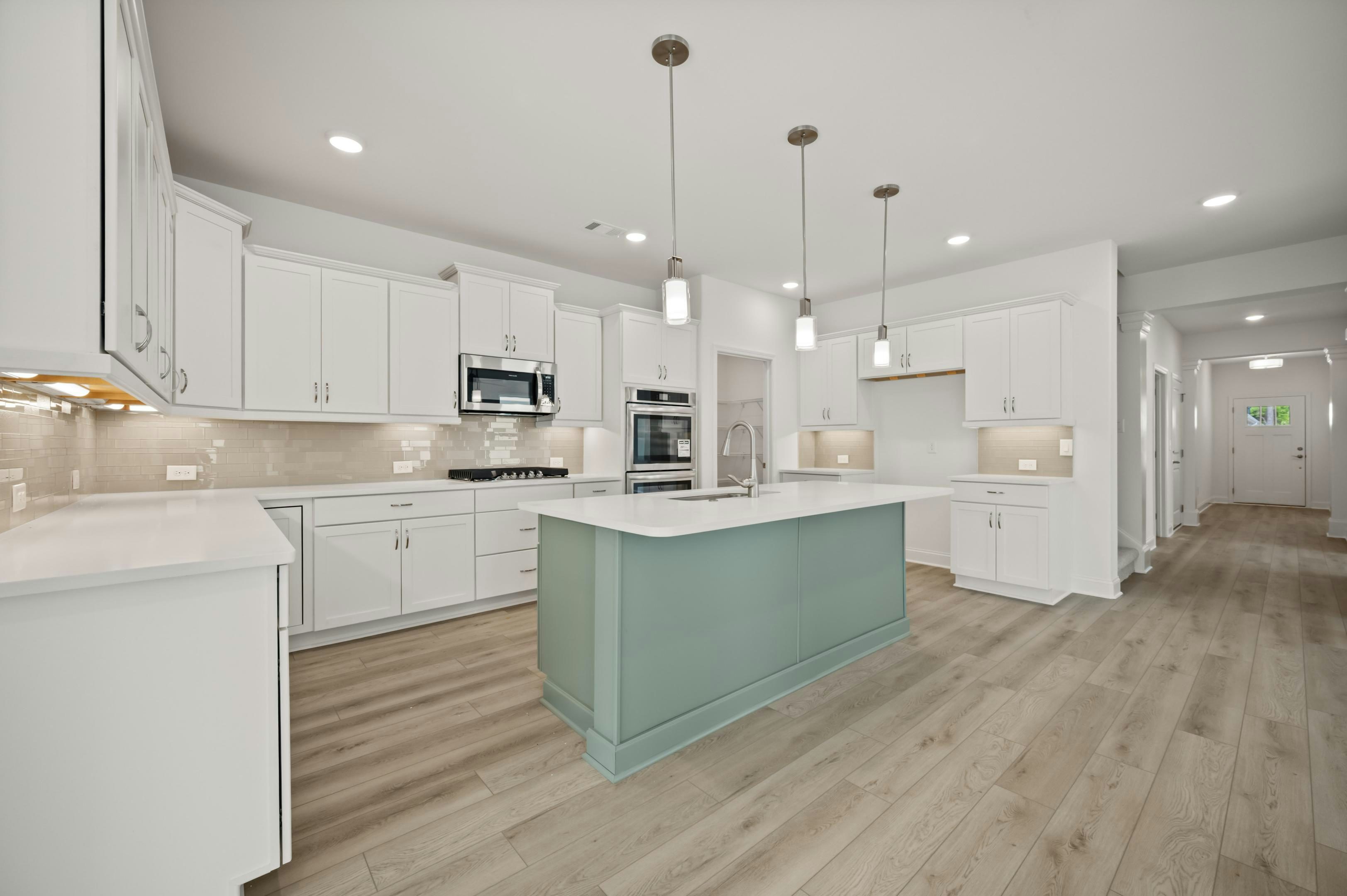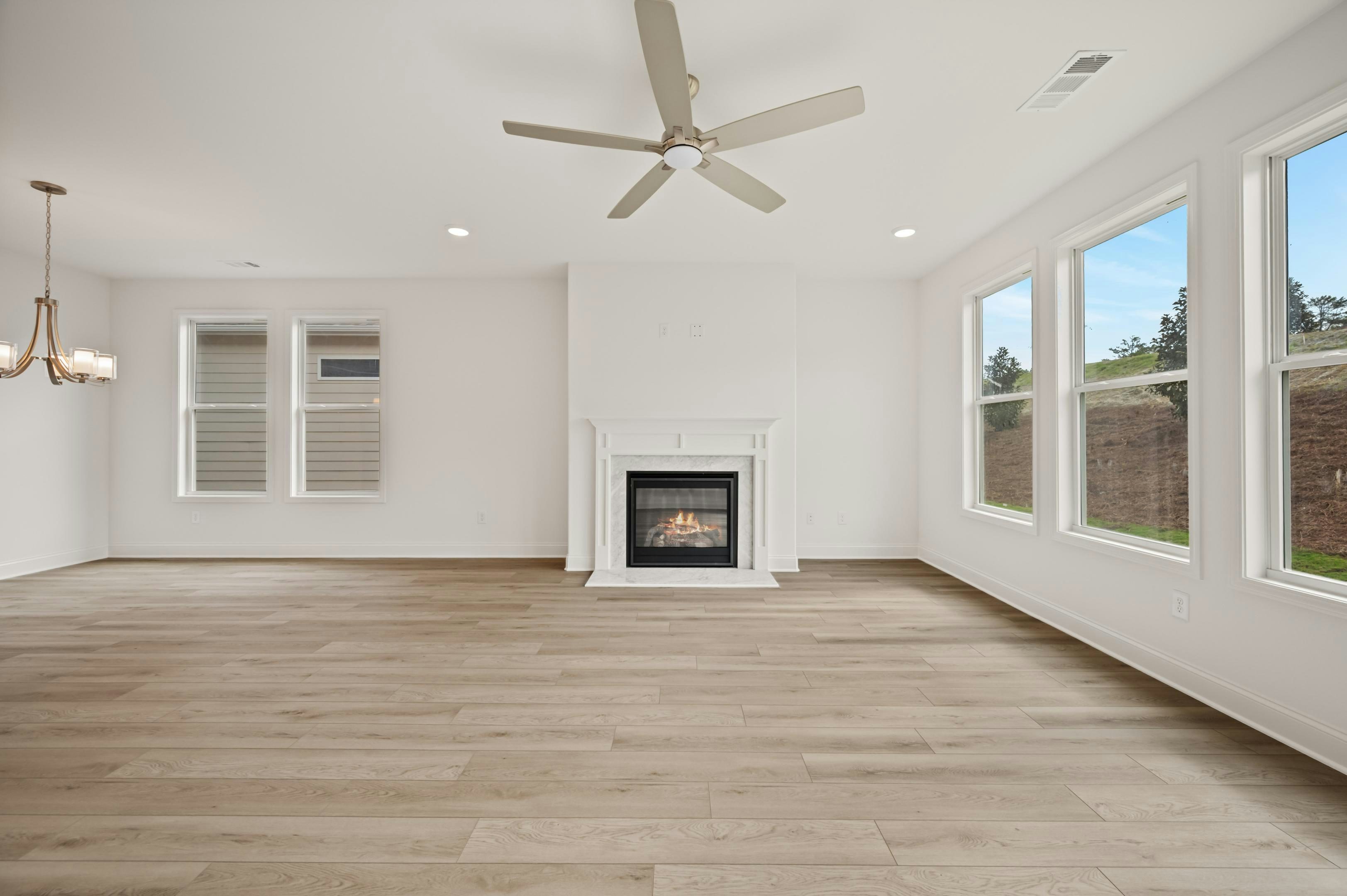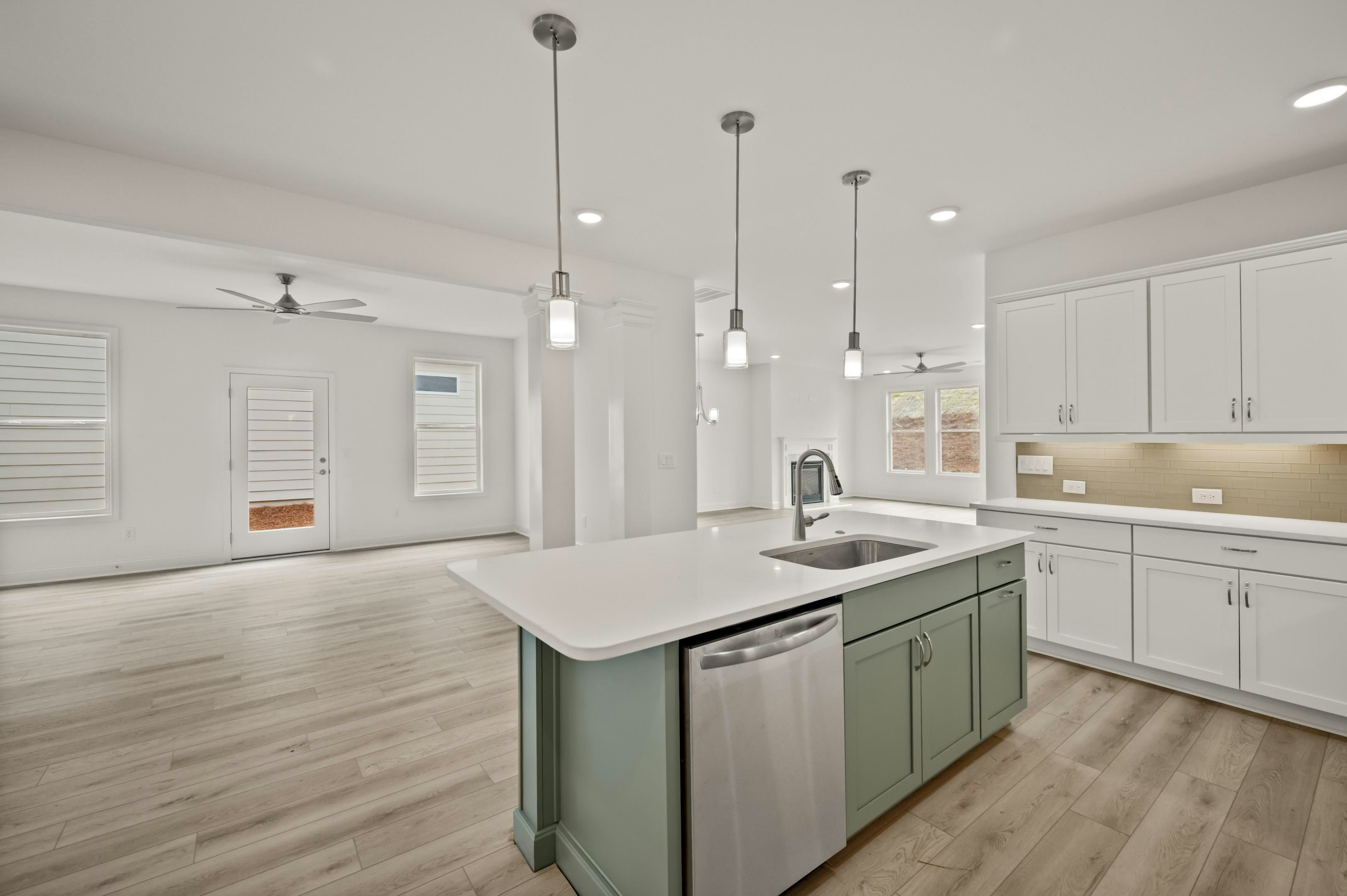 Island Kitchen Opens to Dining and Great Room with Fireplace