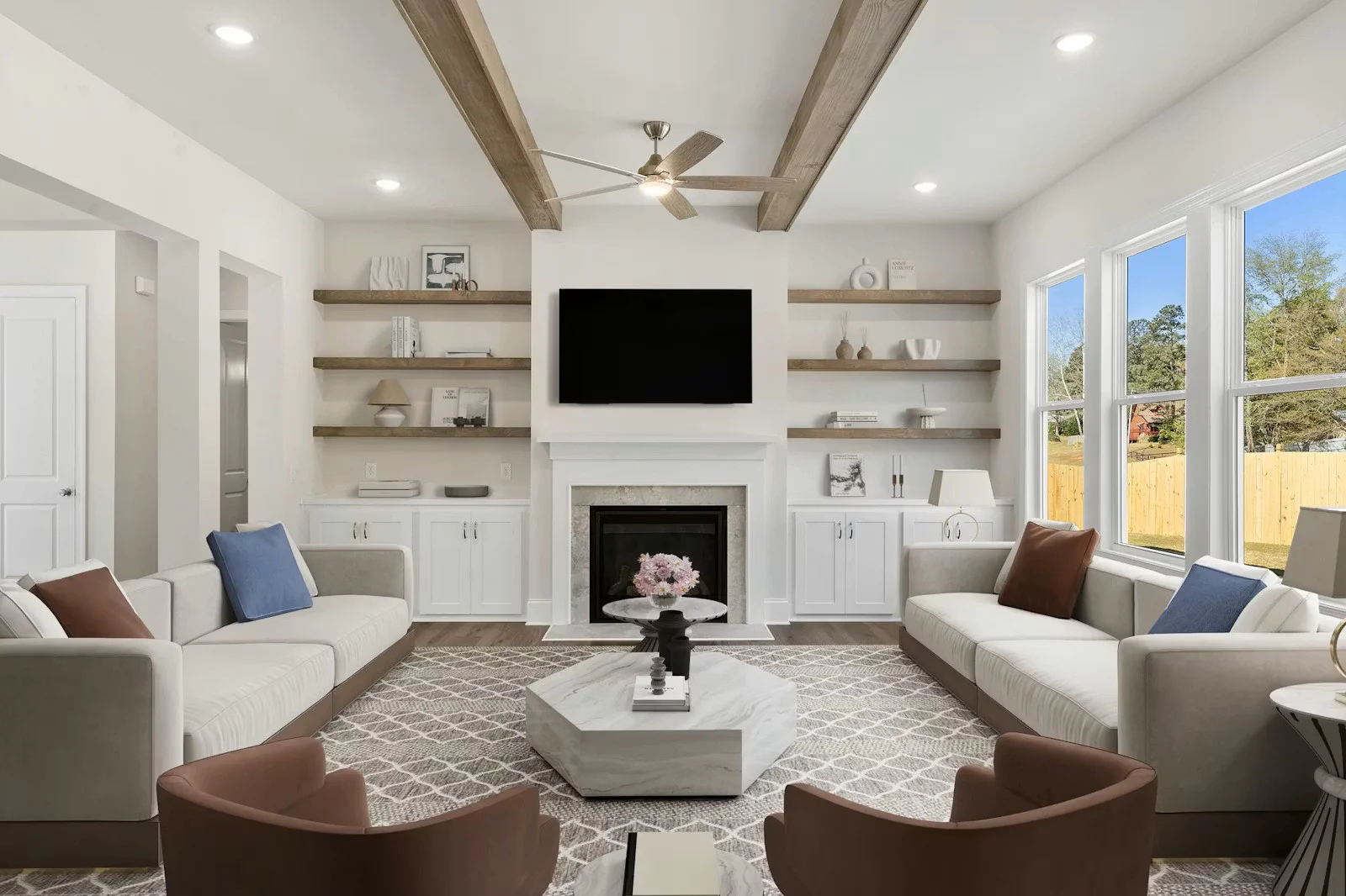 The heart of this home is an expansive, open-concept great room that invites conversation. From the soaring beamed ceilings to the cozy fireplace with a gas starter, every detail has been curated for comfort.